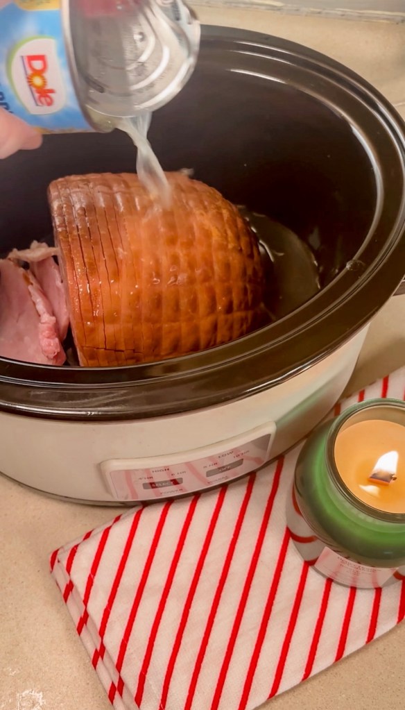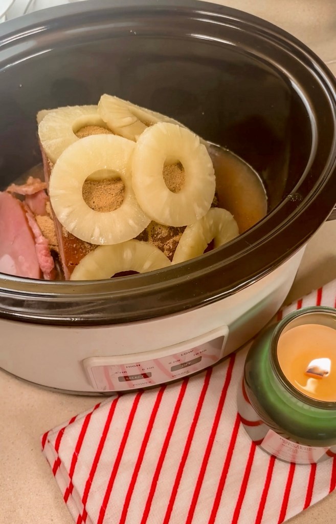First I put the ham into the crockpot and top with all the pineapple juice out of a can of pineapple rings.