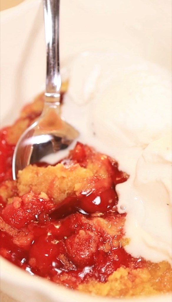 This classic dessert features a luscious cherry pie filling base topped with a golden, buttery cake layer. It’s often served warm with a scoop of vanilla ice cream, making it a comforting and delightful treat.