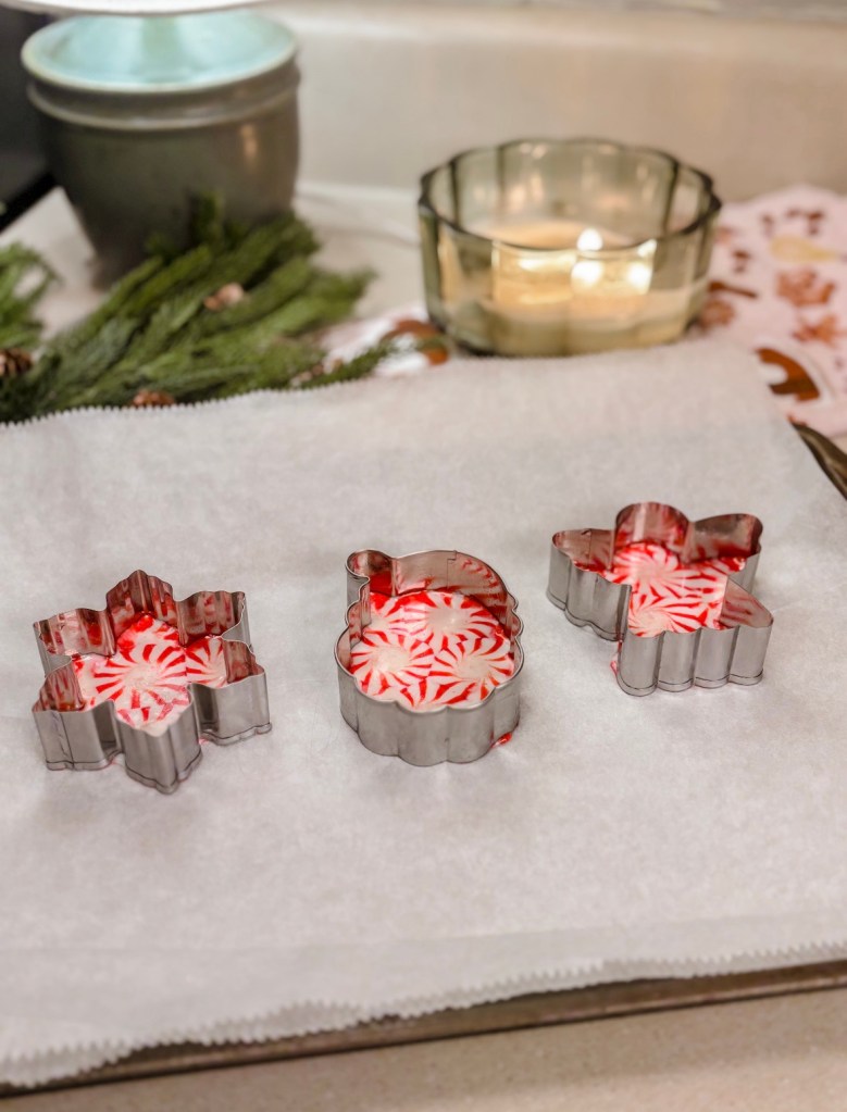 Place the cookie cutters on your lined baking sheet. Fill each one with a single layer of hard candy peppermints— either whole or slightly crushed for a different look. You can mix colors or keep it classic red and white! - Bake the Ornaments